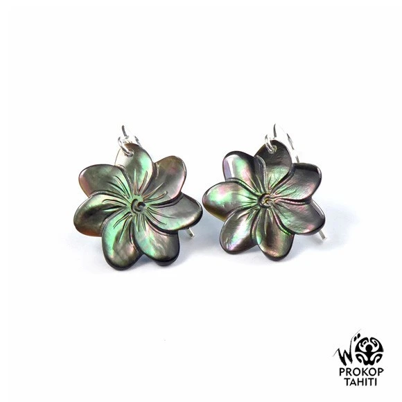 • Tiare Tahiti 7 pétales en nacre ton foncé uniforme reflets verts (diamètre : 2 cm).