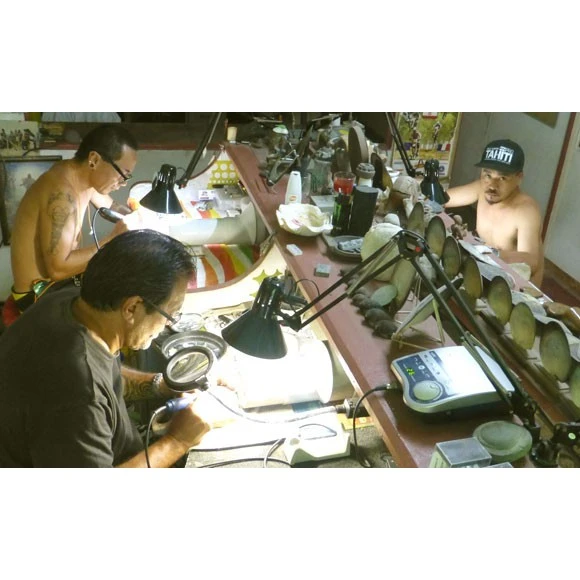 La Boutique du Monoï a sélectionné pour vous cet élégant pendentif en nacre gravée entièrement fabriqué à Tahiti par Woïta Prokop pour sa qualité remarquable.