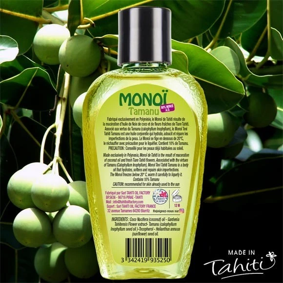 • Huile 100% naturelle produite par Tahiti Oil Factory, Producteur de Monoï de Tahiti Appellation d’Origine et d’Huile de Tamanu.