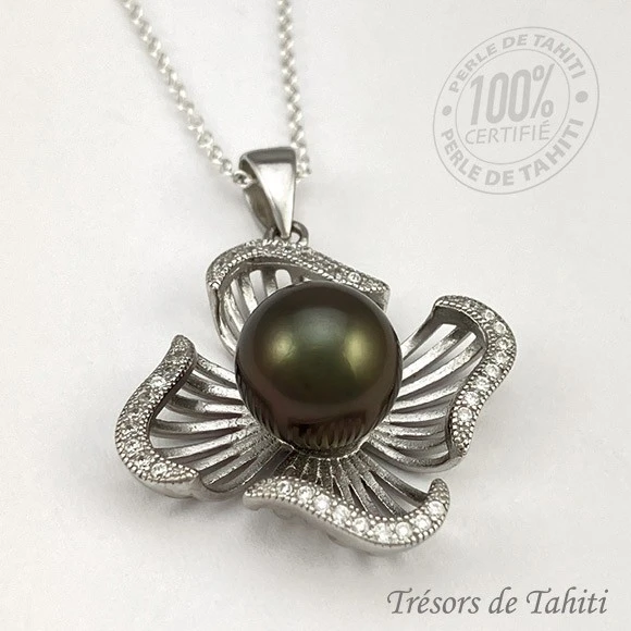 • Perle de Tahiti Semi-Ronde : Couleur Gris foncé, avec un beau lustre, et un diamètre de 9,57 mm. Qualité AA+ selon Gemmologica Institute of America.