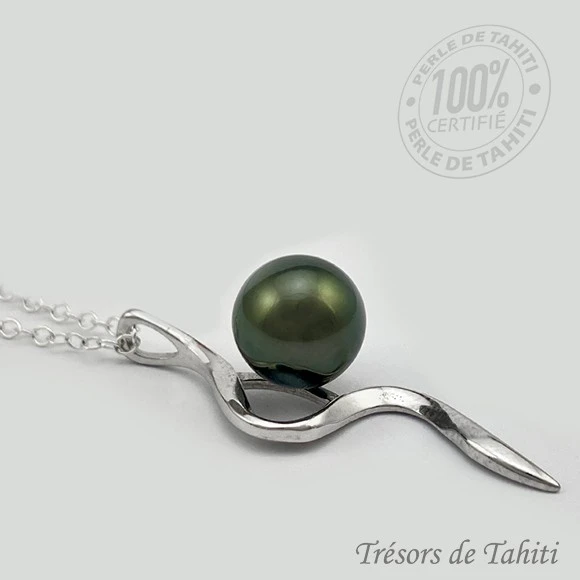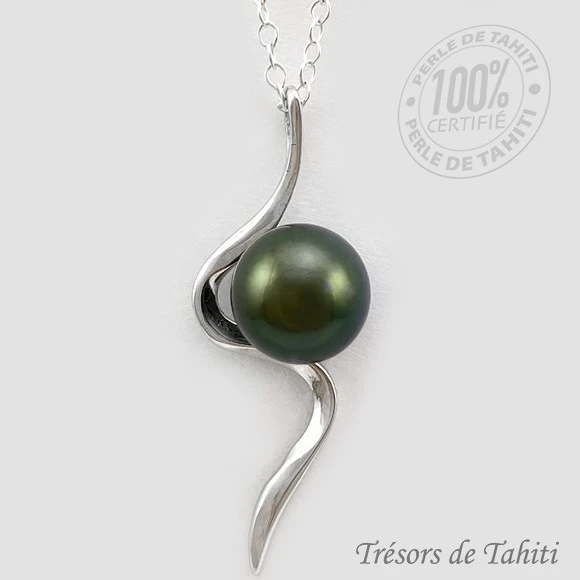 • Perle de Tahiti Semi-Ronde : Couleur Gris foncé reflets Vert, avec un beau lustre, et un diamètre de 8,77 mm. Qualité AA+ selon Gemmologica Institute of America.