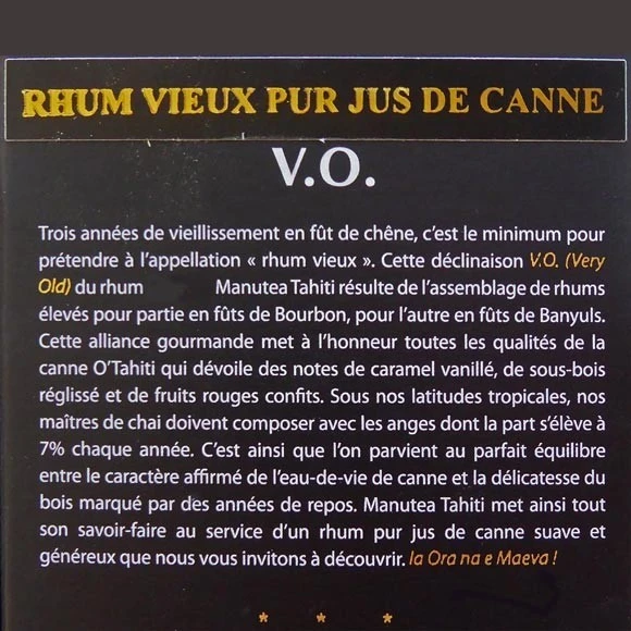 • Rhum VO Very Old vieilli 3 ans en fût de chêne (Bourbon et Banyuls).