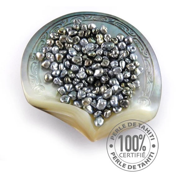 • Un Keishi de Tahiti dans ce flacon, en provenance d’une ferme perlière des Tuamotu Gambier, où cette perle naturelle a été élevée dans la nacre de l’huître perlière Pinctada Margeritifera. En savoir plus ici